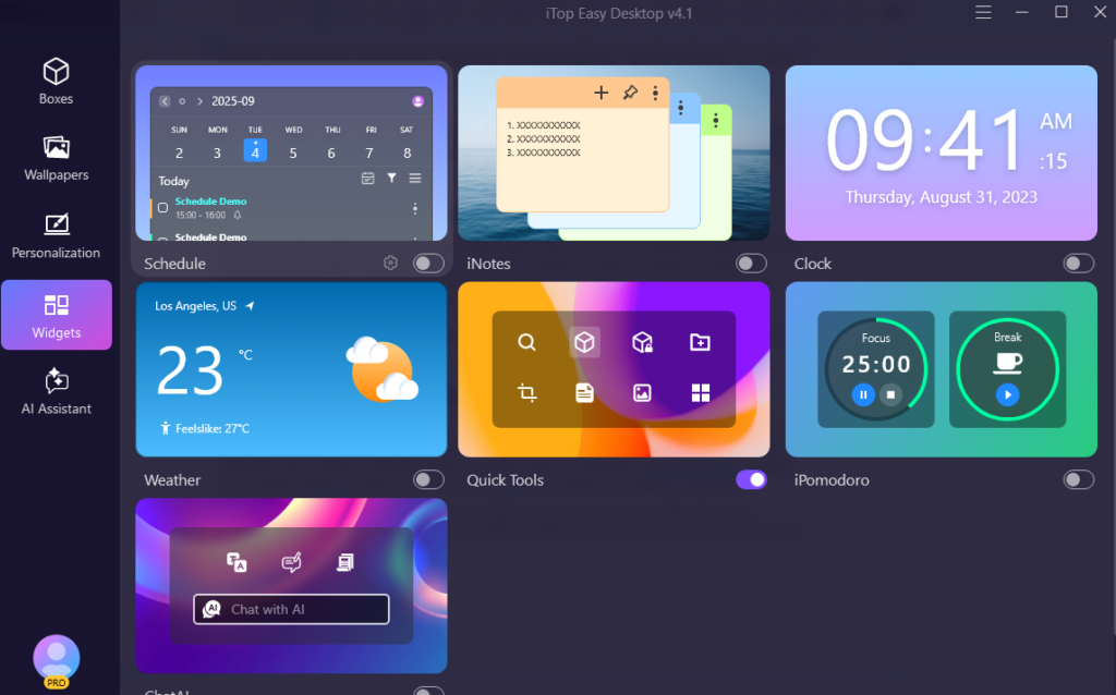 A big part of a good interface is what you always see on your screen. With iTop Easy Desktop, features like the clock widget, weather updates, and iPomodoro timer are always at hand. Over time, these small conveniences help keep your day on track without the need to open extra windows.
