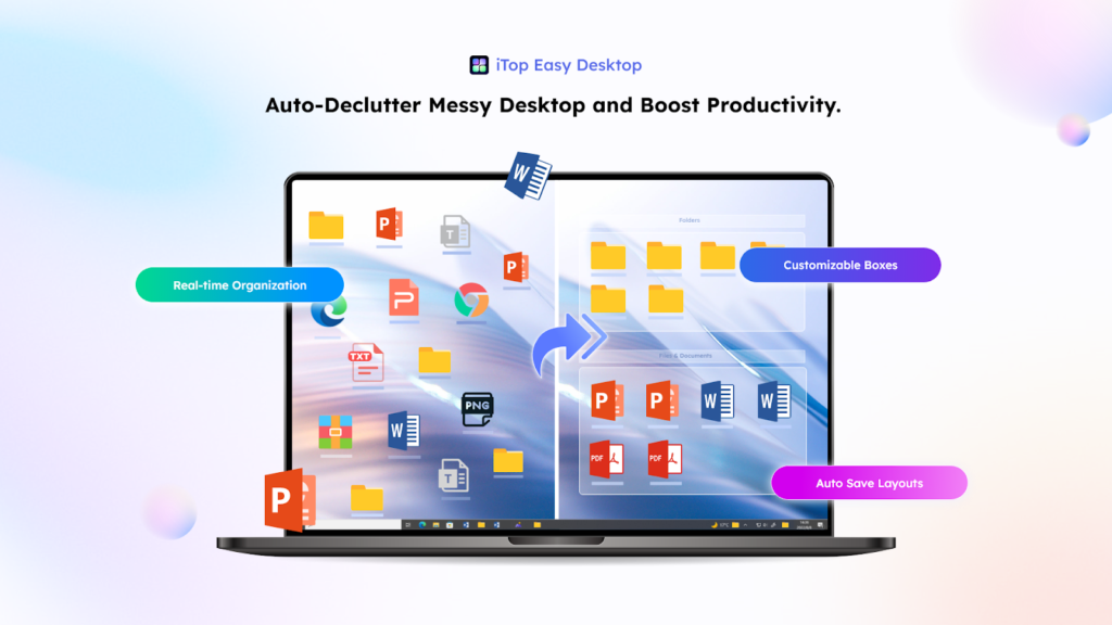 iTop Easy Desktop is here to change that. It tidies up your desktop by grouping your icons into neat boxes, adds handy tools right where you need them, and lets you personalize your Windows layout so it always feels organized and comfortable, no matter how long you’re at your computer.